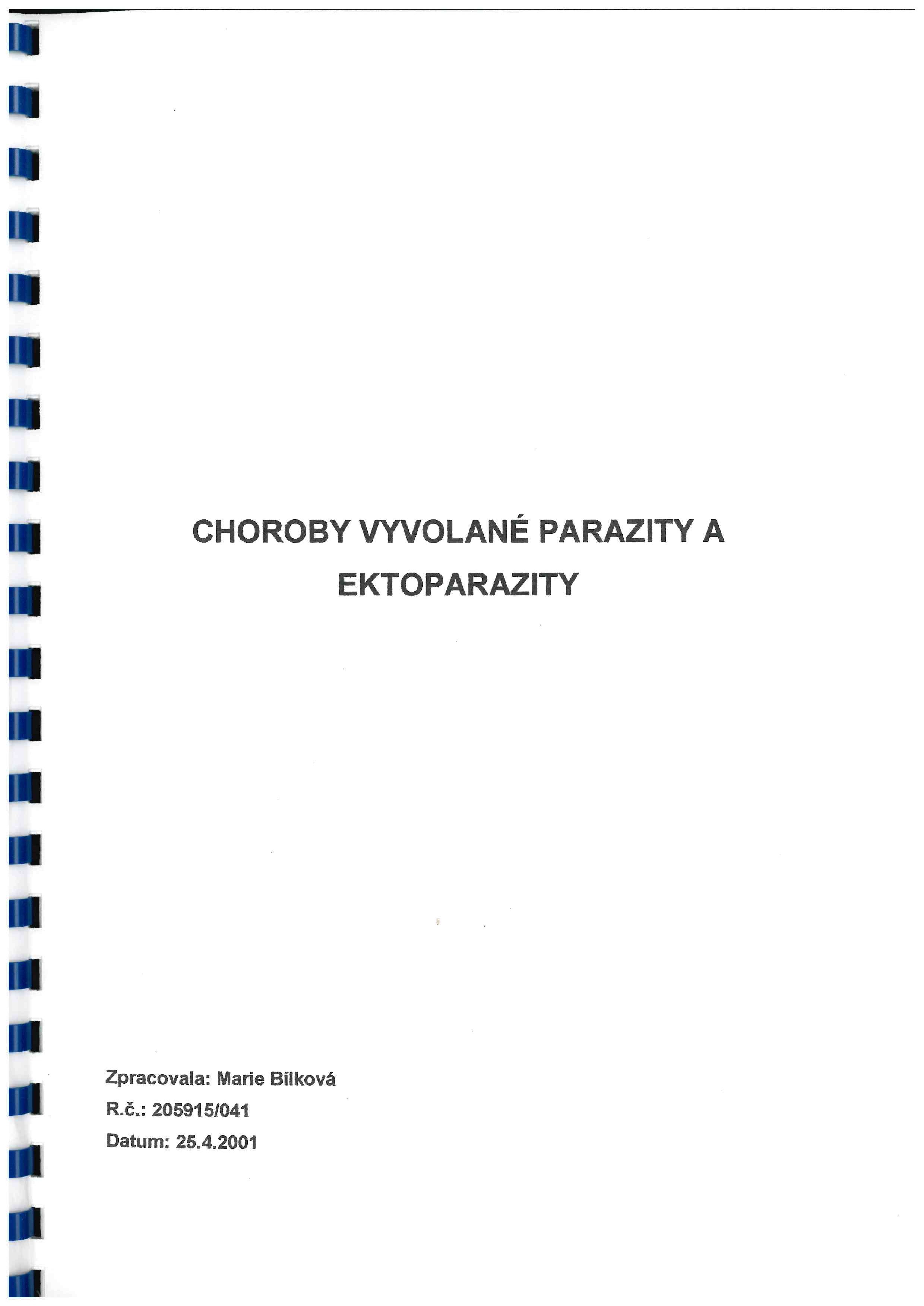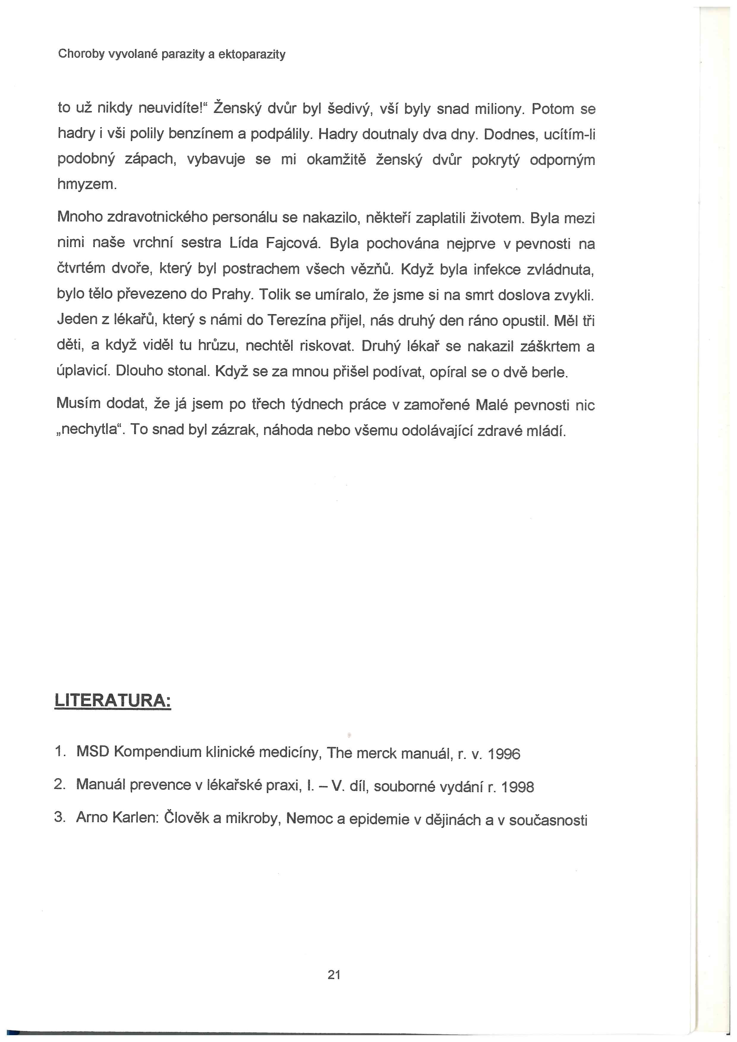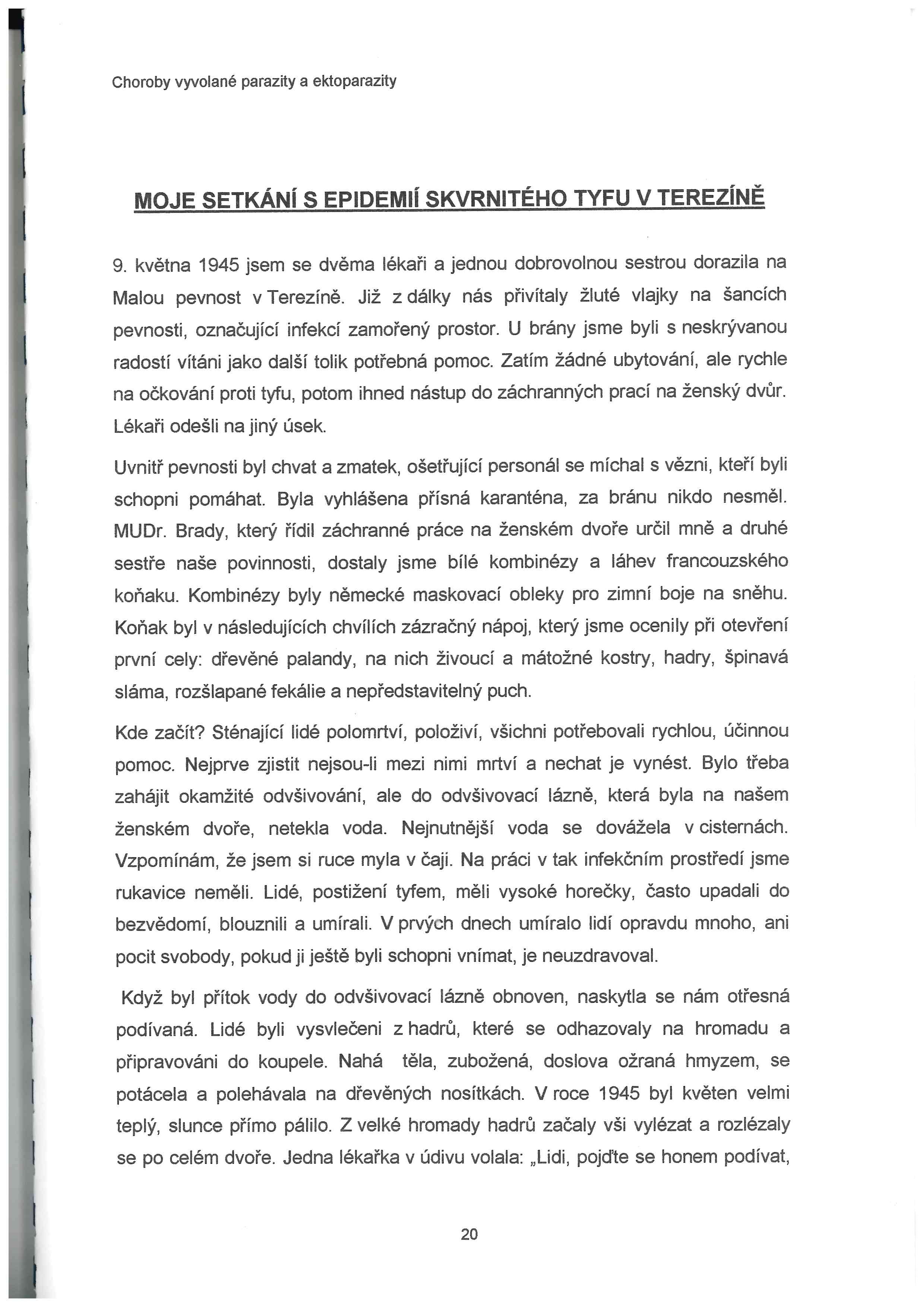 Bílková, Marie: výňatek ze seminární práce "Choroby vyvolané parazity a ektoparazity" popisující tyfovou epidemii v Terezíně
